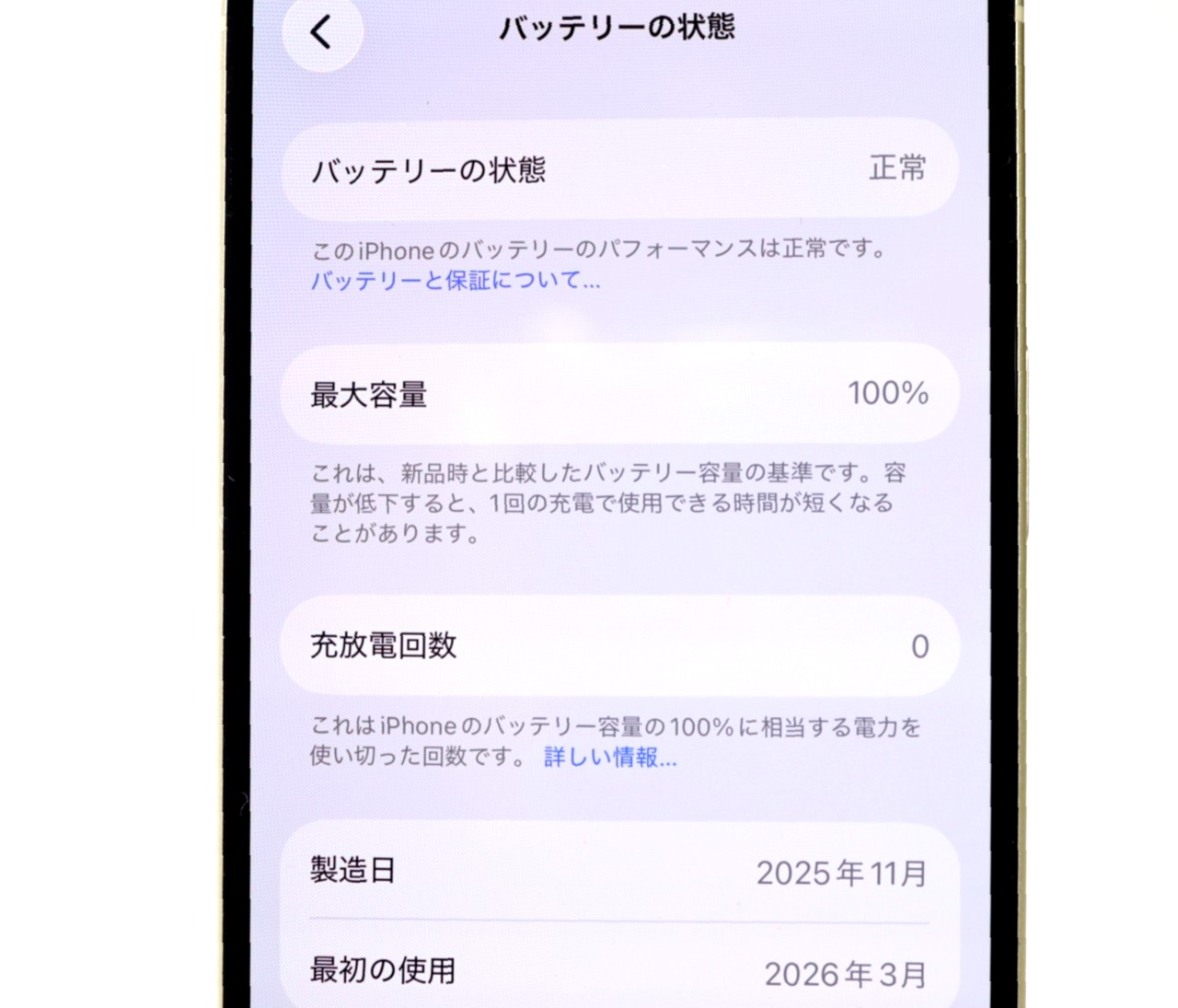 バッテリー最大容量=100% ※充放電回数ゼロです。