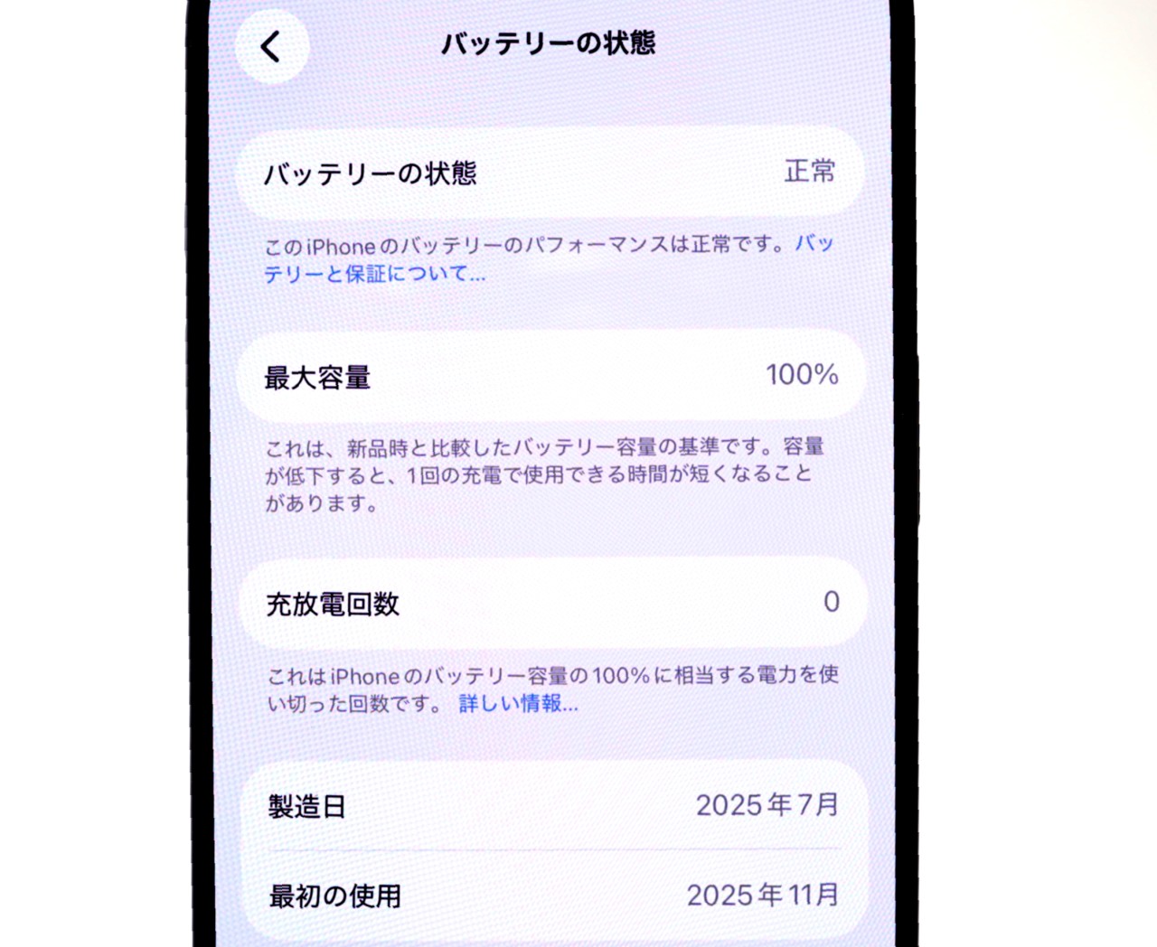 バッテリー最大容量=100% ※充放電回数ゼロです。