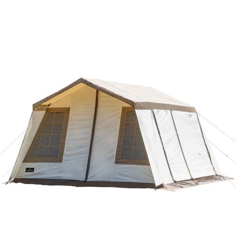 オーナーロッジタイプ52のリニューアルモデル 広々空間のロッジテント 前後左右にメッシュつき インナーには快適なT/C素材を使用 正面両サイドは可愛い格子窓デザイン テント内から開閉できます